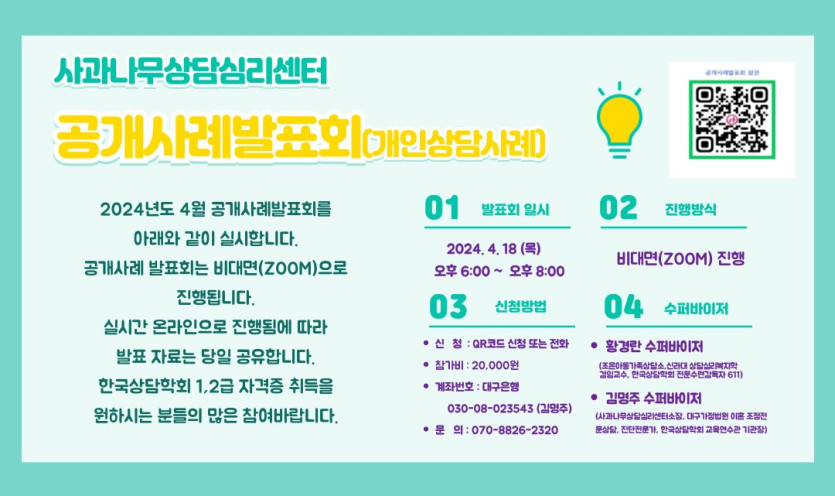 2024년 4월 공개사례발표회 참관자 신청 안내 페이지 정보 작성자운영자 댓글댓글 0건 조회조회 1,224회 작성일 24-04-03 11:29 본문 * 수련생은 무료입니다. 목록 답변 이전글 에니어그램을 이용한 상담의 실제 24.05.13 다음글유아, 아동 상담전문가 2급, 상담전문가 1급 선생님 모셔요. 24.02.05 댓글목록 댓글목록 등록된 댓글이 없습니다.