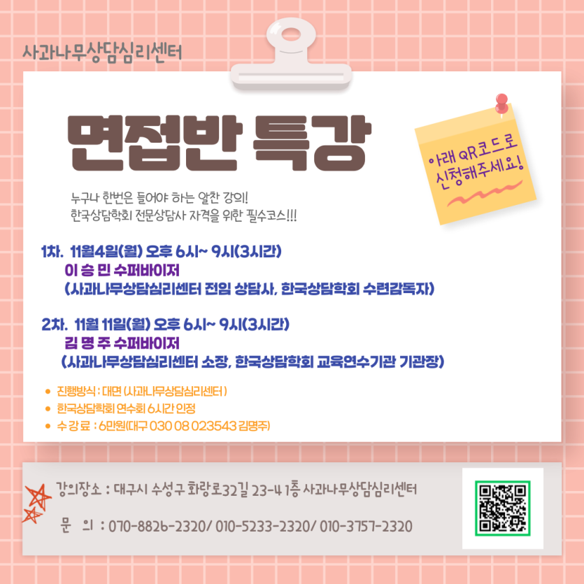 한국상담학회 전문상담사 면접을 위한 면접반 특강 페이지 정보 작성자사과나무상담 댓글댓글 0건 조회조회 1,136회 작성일 24-10-29 14:49 본문 많은 신청바랍니다. 목록 답변 이전글 2025년 전국민마음투자지원사업 상담 받으실 수 있습니다 25.01.15 다음글2024년 10월 공개사례발표회 참관자 신청안내 24.09.30 댓글목록 댓글목록 등록된 댓글이 없습니다.